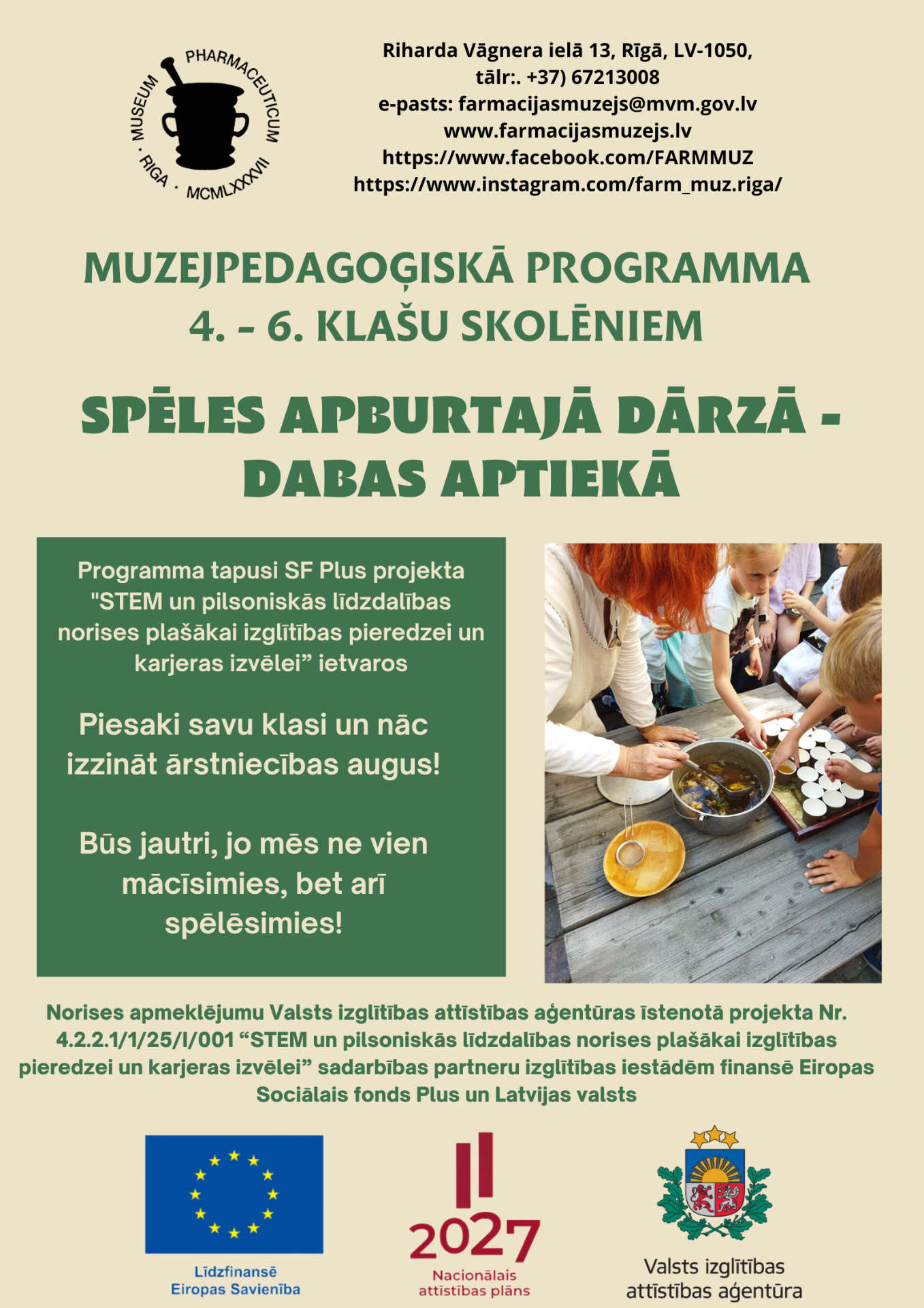 FARMĀCIJAS MUZEJS izglītojošā programma "SPĒLES APBURTAJĀ DĀRZĀ - DABAS APTIEKĀ" ir iekļauta Valsts izglītības attīstības aģentūras īstenotā projekta Nr. 4.2.2.1/1/25/I/001 "STEM un pilsoniskās līdzdalības norises plašākai izglītības pieredzei un karjeras izvēlei" katalogā (Nr. 330).